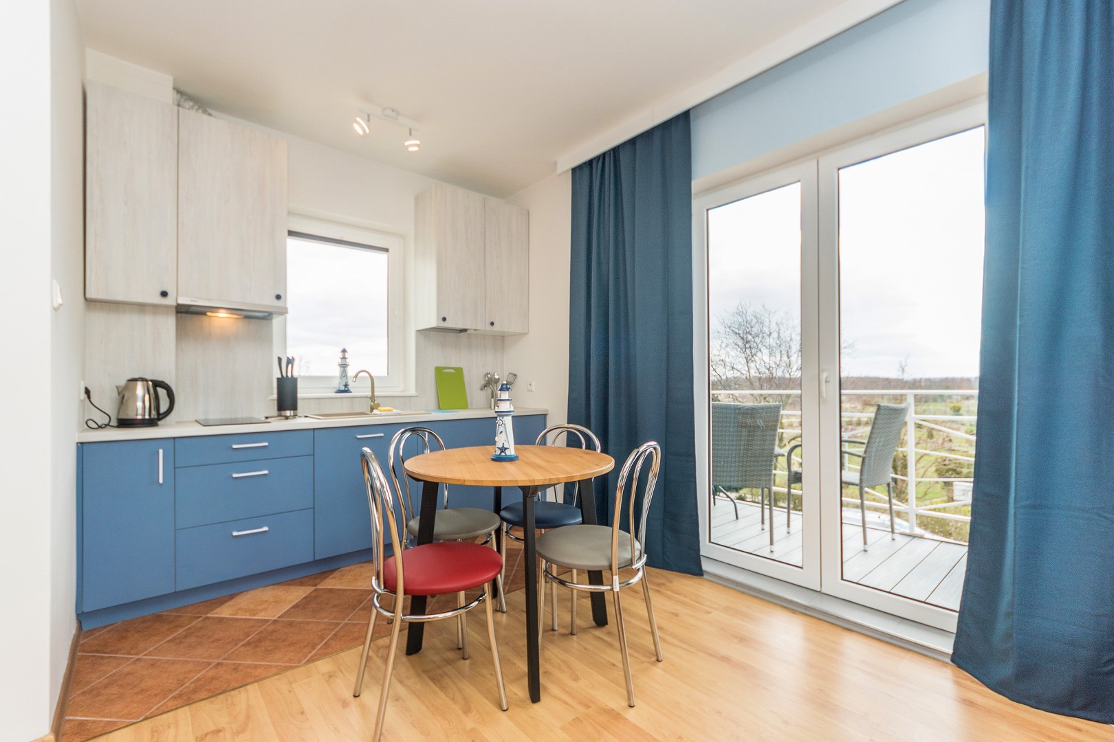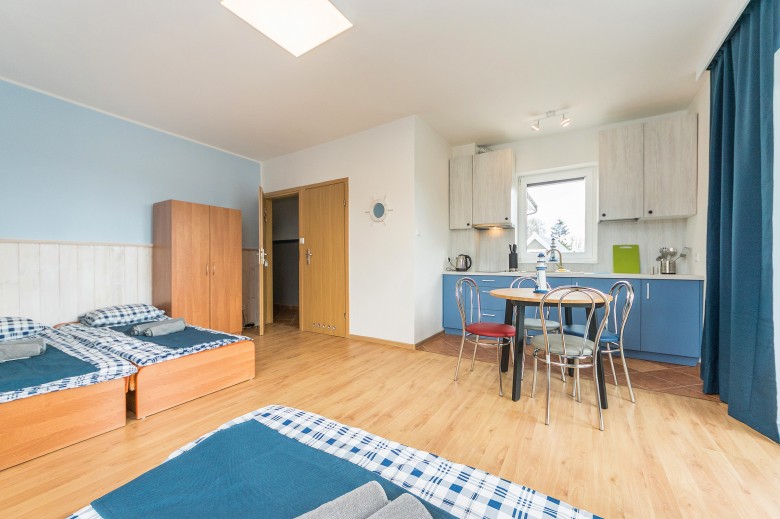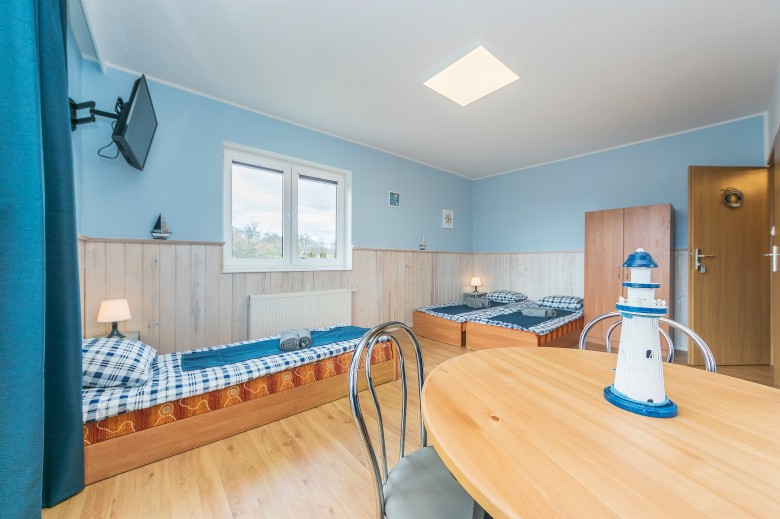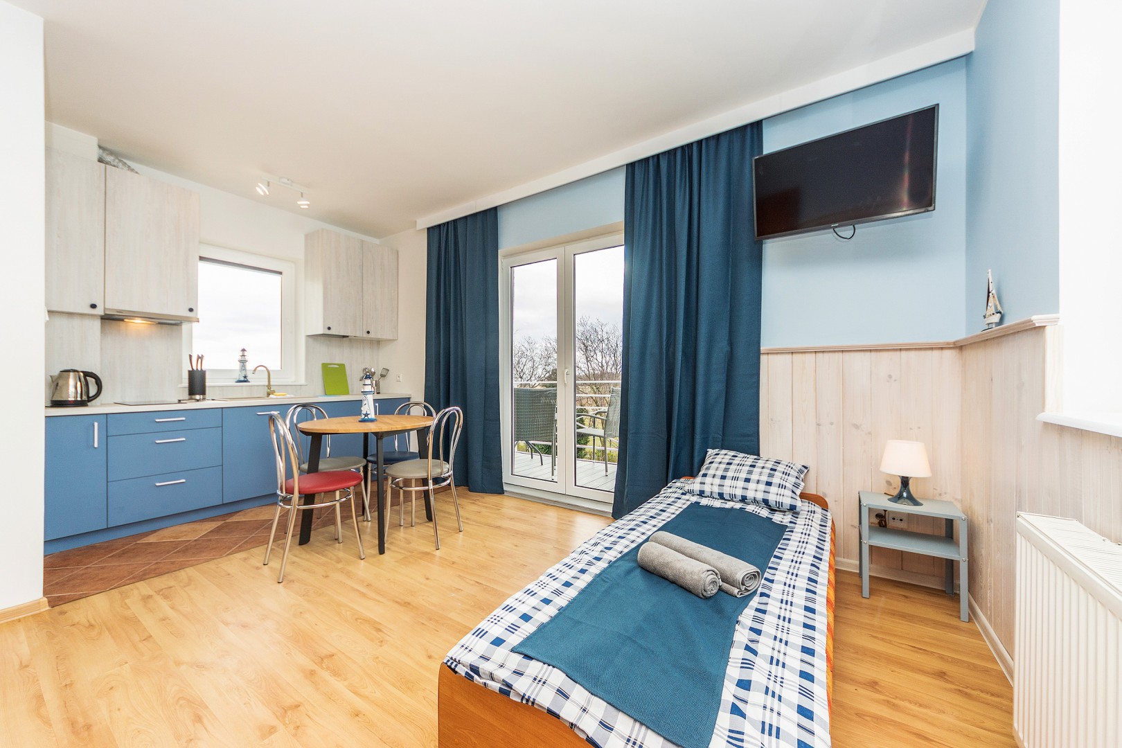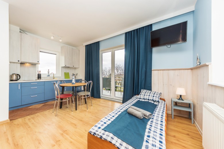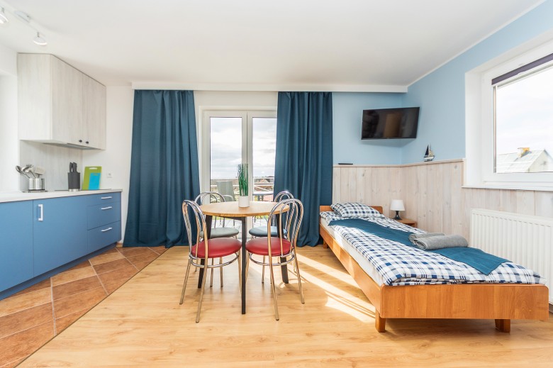 Atmosfera żeglugi i przygody otoczy Cię już w chwili, gdy otworzysz kluczem drzwi do pokoju typu studio - a to dzięki starannie dobranym dekoracjom. Natomiast gdy wyjdziesz na przestronny balkon, zachwyci Cię przepiękna panorama Zatoki Puckiej.